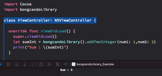 프로젝트의 Example 폴더에서 .xcworkspace 파일을 열고 만들어놓은 함수를 테스트 합니다.