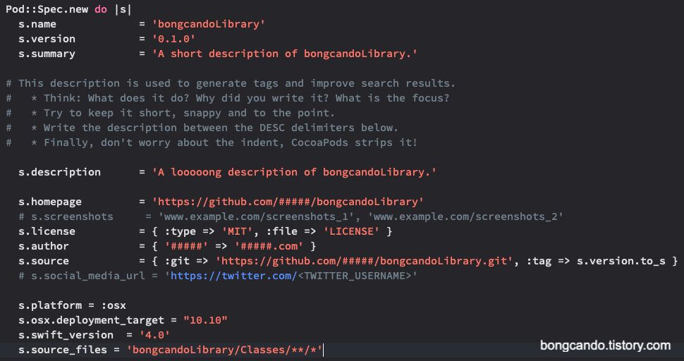 그 다음, 자신이 원하는 스펙대로 .podspec 파일을 작성해주면 됩니다.