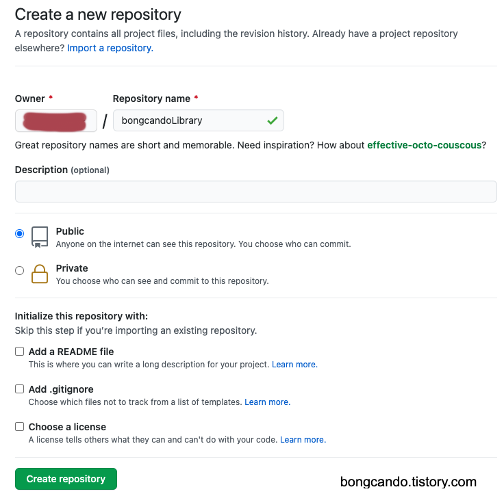 Repository name에 위에서 만든 프로젝트의 이름을 넣고 레포지토리를 생성합니다.