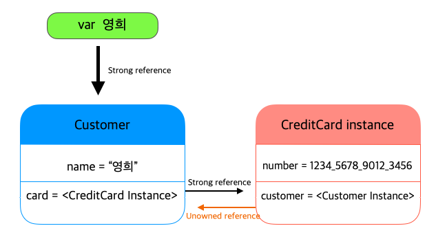 영희는 Customer 인스턴스에 대해 강한 참조를 가지고 있고, CreditCard 인스턴스에 customer에 대한 무소유 참조 Cusomer 인스턴스가 있다.