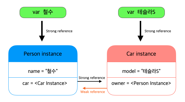 Person 인스턴스는 여전히 Car 인스턴스에 대해 강한 참조를 유지하고 있지만, Car 인스턴스는 Person 인스턴스에 대해 약한 참조를 가지게 된다.
