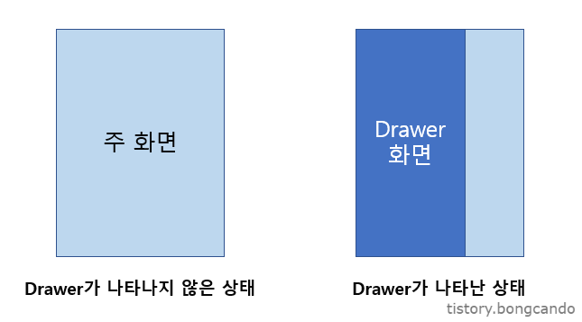 DrawerLayout은 주화면과 특정 액션으로 주화면 위에 나타나는 보조화면 즉, Drawer가 있는데 두 화면의 구성은 다음과 같다.