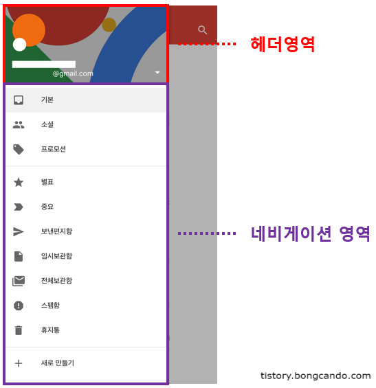 Drawer의 영역은 헤더 부분과 Navigation부분으로 나누어져있으며 헤더부분을 사용하지 않을경우 헤더 레이아웃은 만들지 않아도 된다.